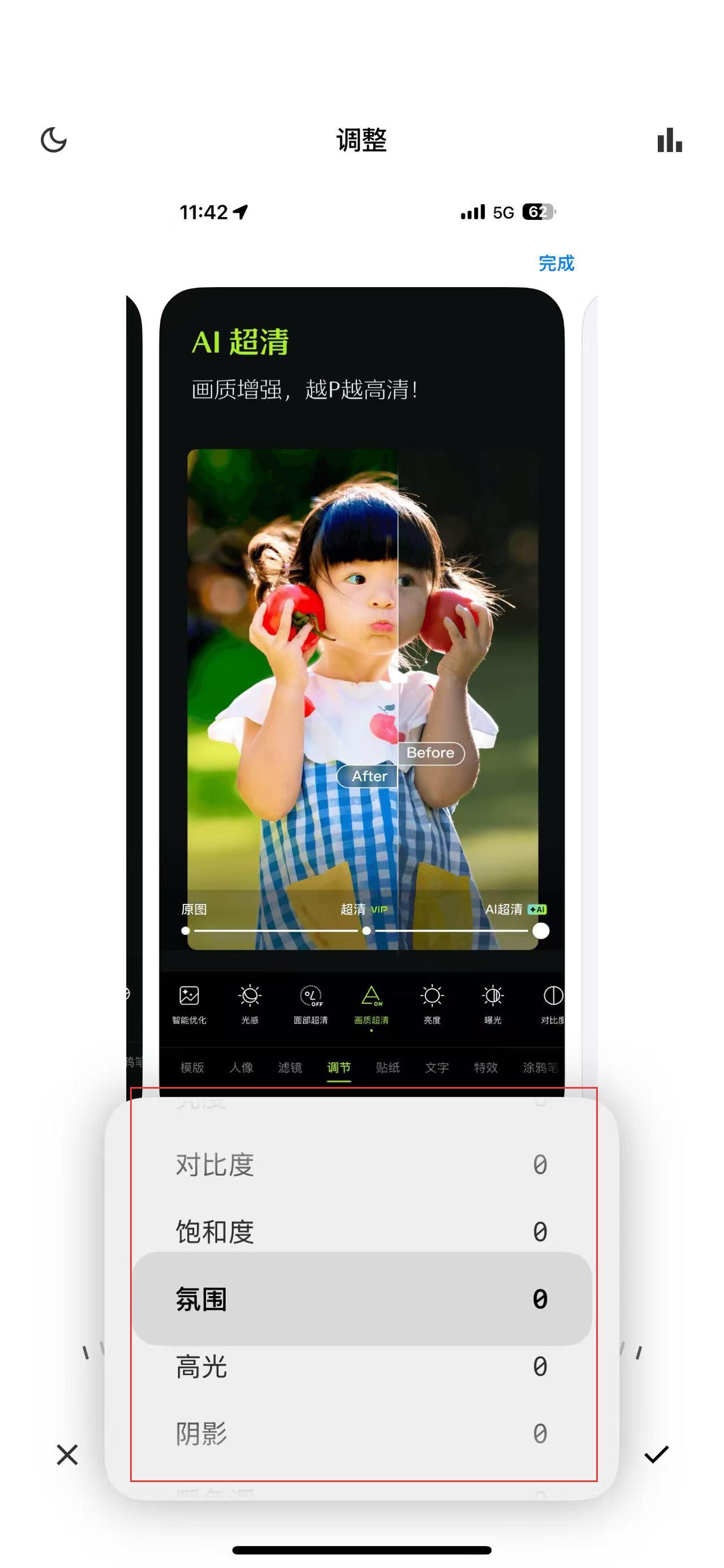 3、依次調(diào)節(jié)對比度、飽和度、氛圍等參數(shù)后,點擊確認,保存調(diào)整后的圖片,完成畫面優(yōu)化,讓照片更出彩。