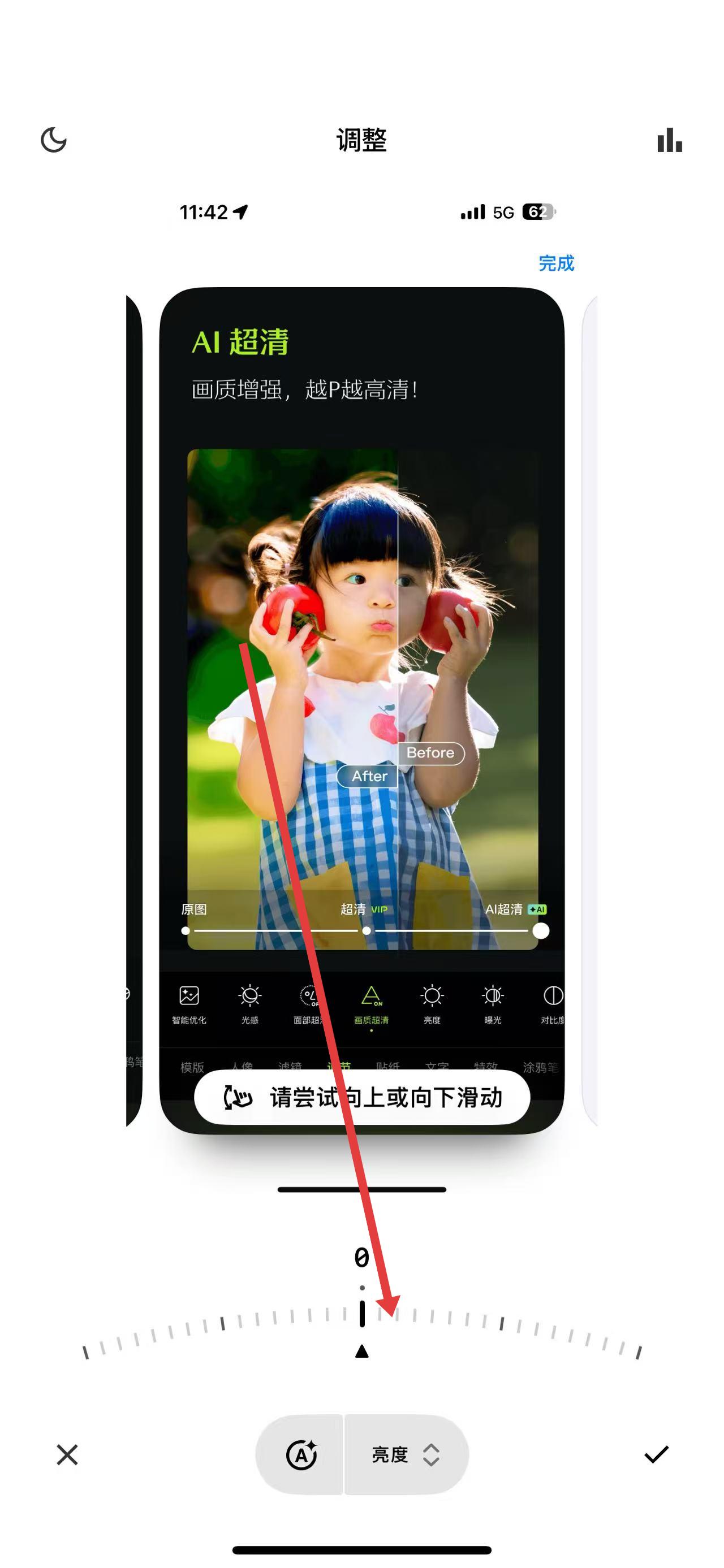 2、在調(diào)整頁,按提示上下滑動切換參數(shù)如亮度、對比度等 ,拖動刻度調(diào)整數(shù)值,精準優(yōu)化畫面效果。
