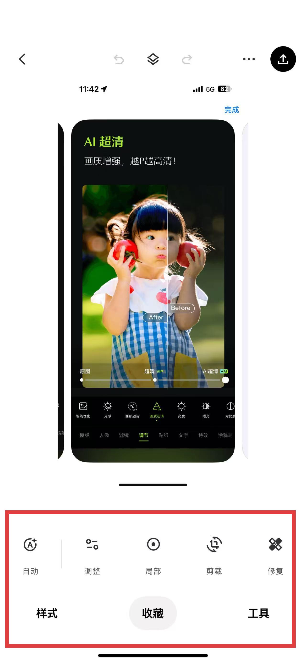 1、進入修圖APP,在編輯界面底部點擊工具-調(diào)整,開啟畫面參數(shù)調(diào)節(jié)流程。