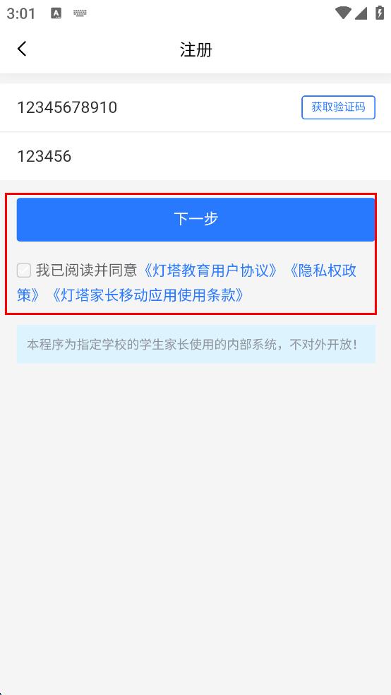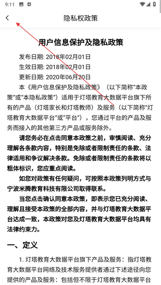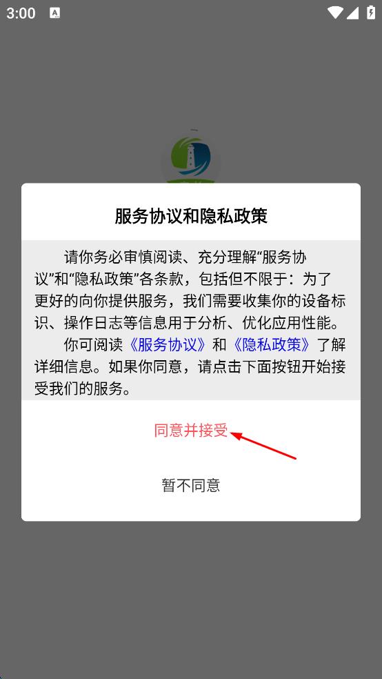 1、打開燈塔教育APP,出現(xiàn)服務(wù)協(xié)議和隱私政策頁面,仔細查看后點擊“同意并接受”按鈕。