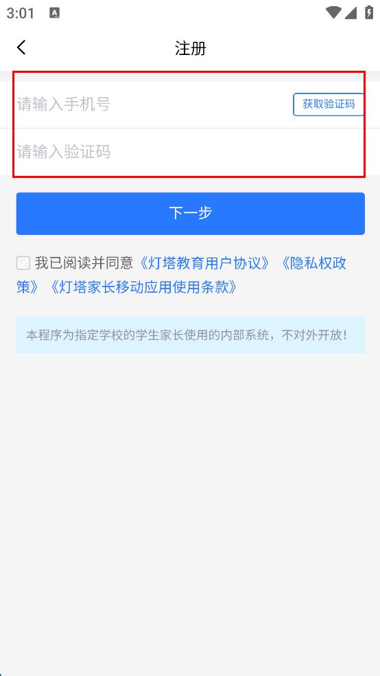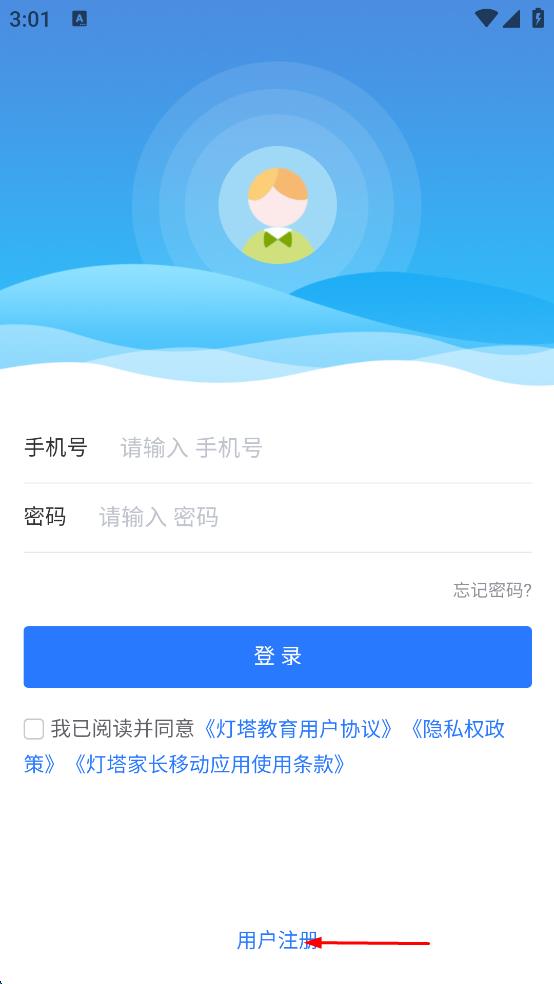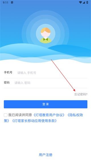 1、打開燈塔家長APP,在登錄頁面點擊忘記密碼選項。