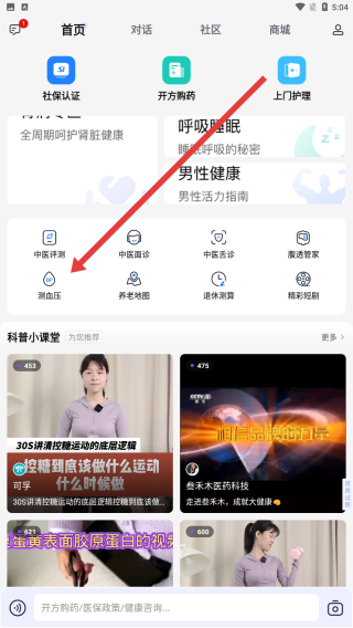 1、在老來健康首頁中,點(diǎn)擊測(cè)血壓按鈕,進(jìn)入測(cè)量。