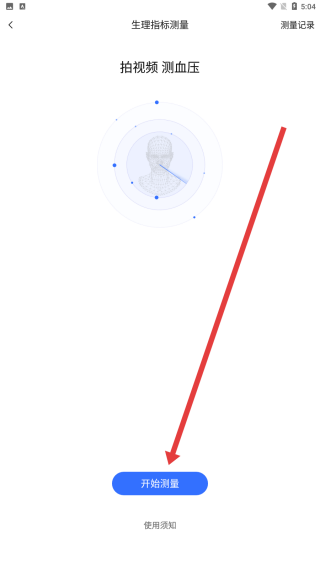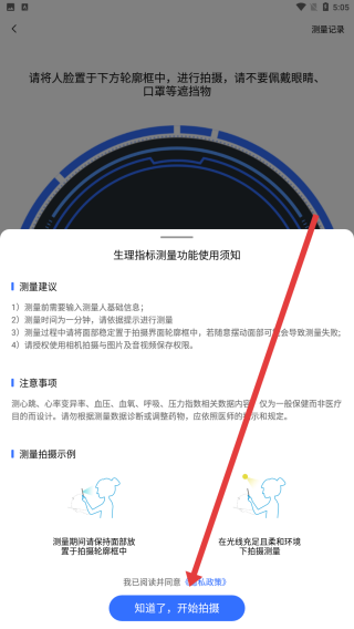 3、進(jìn)入拍攝環(huán)節(jié)查看使用須知后,點(diǎn)擊開始拍攝按鈕測(cè)量血壓。