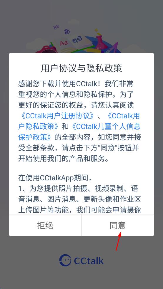 1、打開(kāi)CCtalk應(yīng)用,會(huì)彈出用戶(hù)協(xié)議與隱私政策彈窗,仔細(xì)閱讀相關(guān)內(nèi)容后,點(diǎn)擊“同意”,進(jìn)入軟件相關(guān)頁(yè)面。