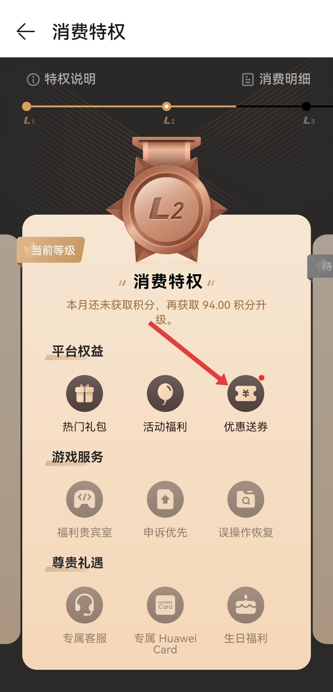3、在消費特權(quán)的頁面,點擊優(yōu)惠送券的選項,進入優(yōu)惠券贈送的頁面。