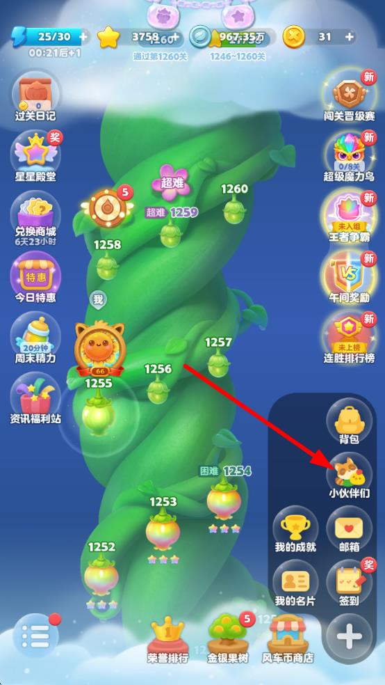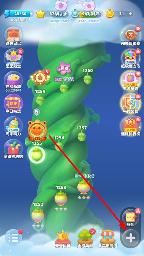 1、打開開心消消樂游戲,在主界面點擊右側的加號圖標,展開隱藏菜單。