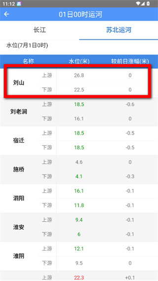 3、在蘇北運河水位列表中,可查看劉山、劉老澗等多個地點的上游、下游水位及較前日漲幅信息。