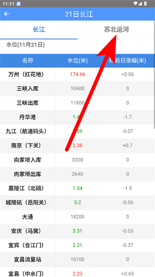 2、在水位查看頁面,點擊蘇北運河選項,切換至蘇北運河水位列表。