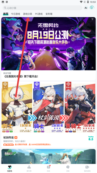 1、在TapTap首頁點擊頂部游戲分類,進入分類篩選頁面,可按多維度查找游戲,開啟游戲探索第一步。