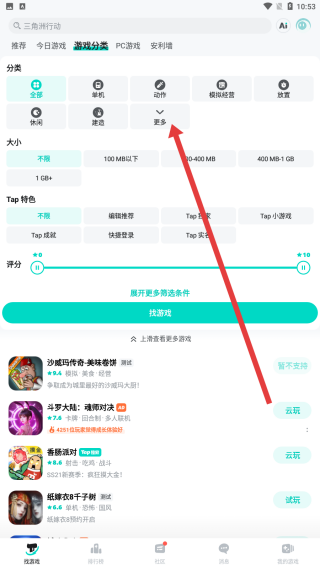 2、進入游戲分類頁后,點擊分類欄的更多按鈕,展開隱藏分類選項,獲取更豐富的游戲類型篩選條件。