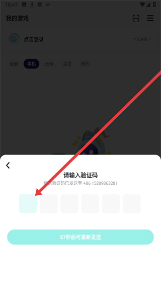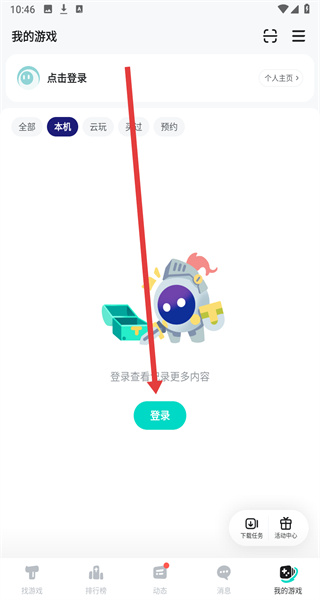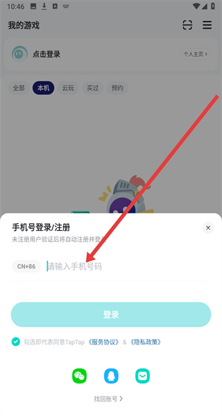 2、在“我的游戲”頁面點擊“登錄”按鈕,進入手機號登錄/注冊界面。