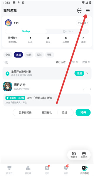 1、在我的游戲頁面中,點擊右上方菜單按鈕,展開側(cè)邊欄進行查看。