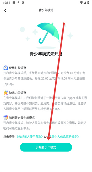 4、進入到青少年模式頁面中,在了解青少年模式詳情后,可以點擊下方開啟按鈕進行開啟。