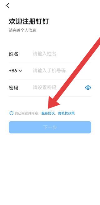 1、注冊釘釘時,填寫姓名、手機號、密碼,勾選服務(wù)協(xié)議、隱私政策后,點擊下一步推進注冊。