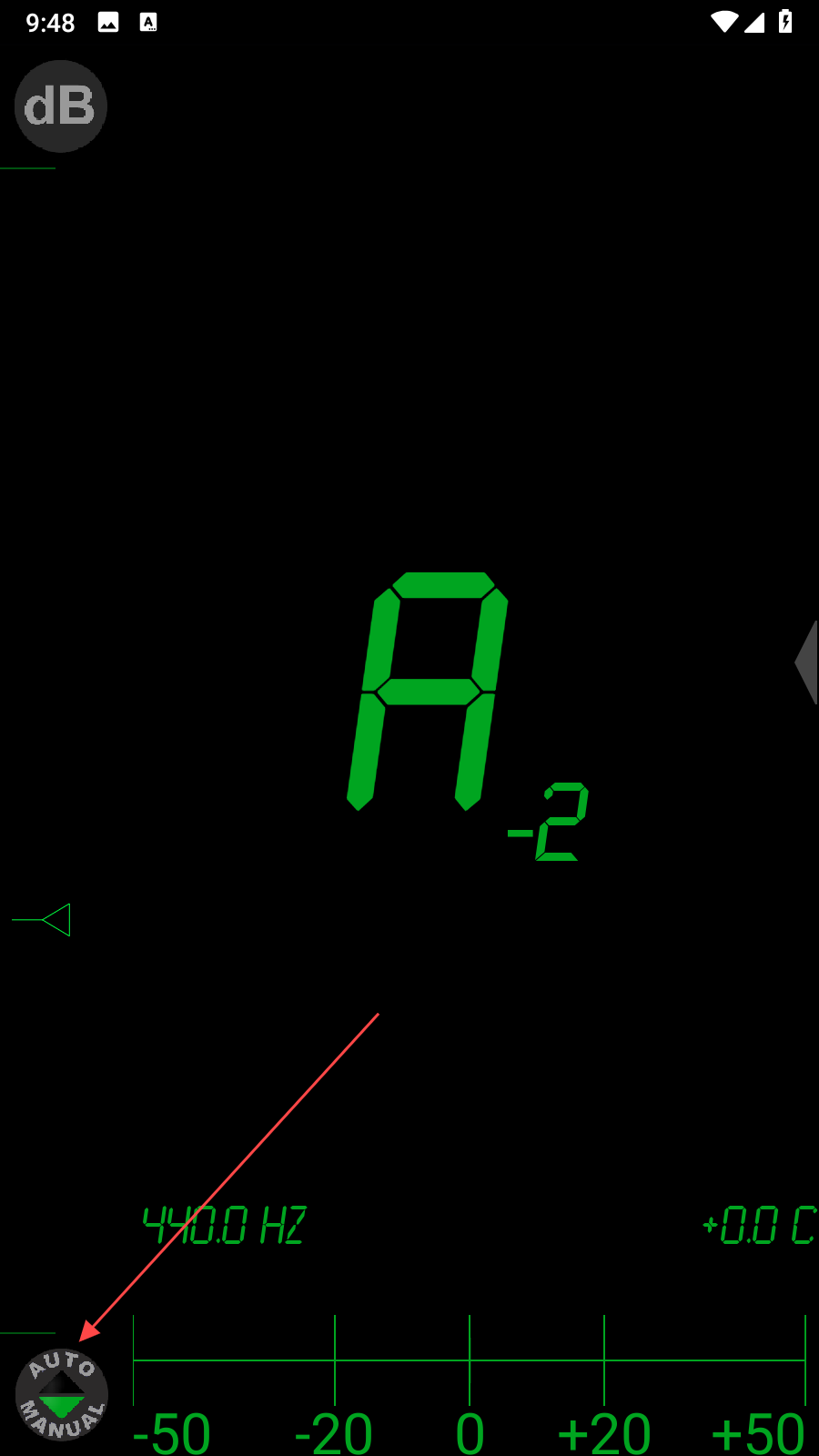 1、打開(kāi)半音調(diào)諧器應(yīng)用進(jìn)入主界面,點(diǎn)擊界面左下角AUTO/MANUAL按鈕,可在自動(dòng)和手動(dòng)模式間切換,自動(dòng)模式下應(yīng)用能自動(dòng)識(shí)別音調(diào),手動(dòng)模式則可自行調(diào)整參數(shù)。