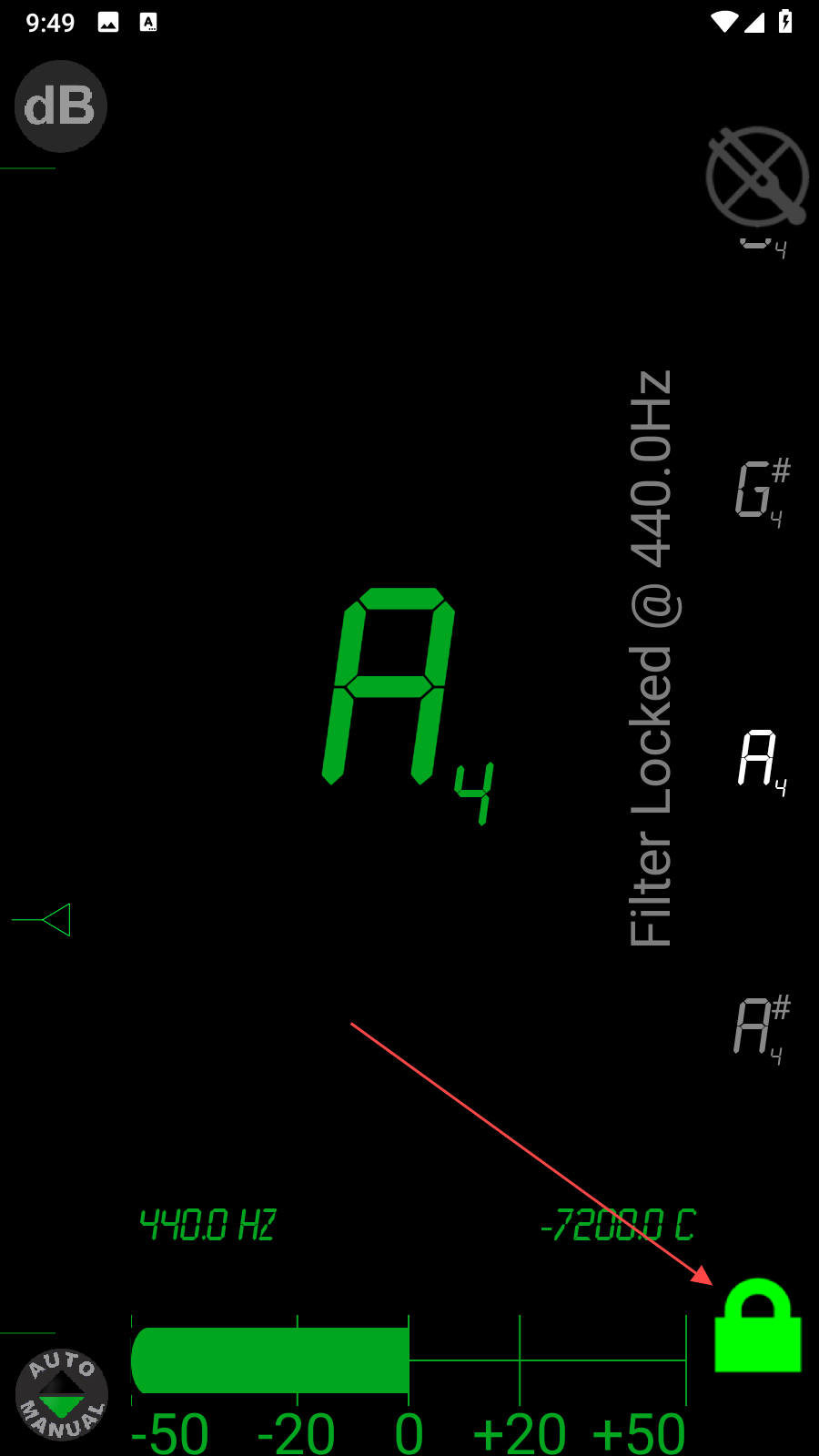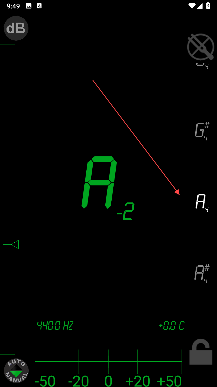 3、若要鎖定特定頻率進(jìn)行精準(zhǔn)調(diào)音,點(diǎn)擊界面右下角的鎖形圖標(biāo),將其變?yōu)榫G色鎖定狀態(tài),此時(shí)就能專注調(diào)整至目標(biāo)頻率,確保樂(lè)器或發(fā)聲對(duì)象達(dá)到所需音準(zhǔn)。