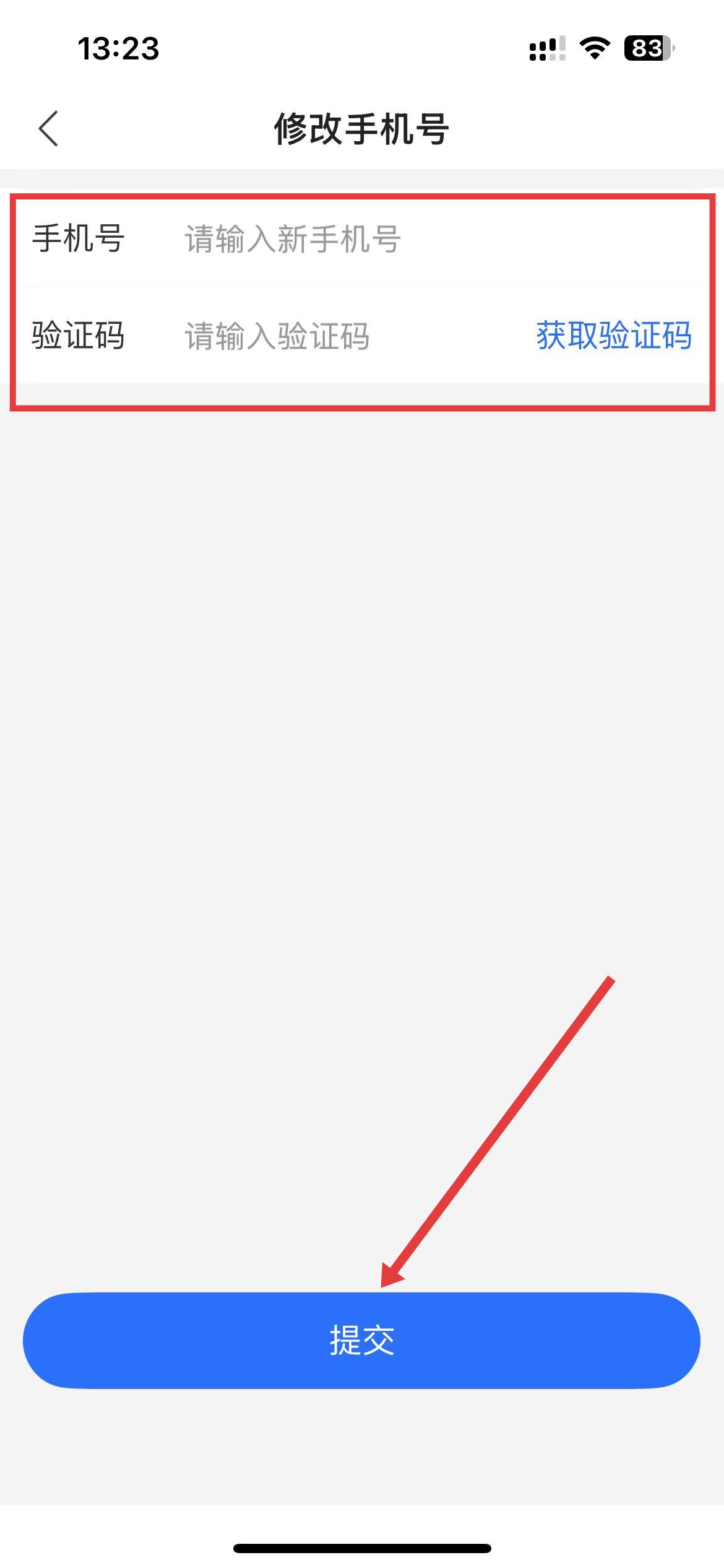 5、在修改手機號頁面,輸入新手機號,獲取輸入驗證碼,最后點擊提交,即可完成手機號修改。