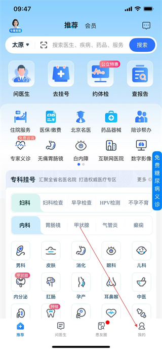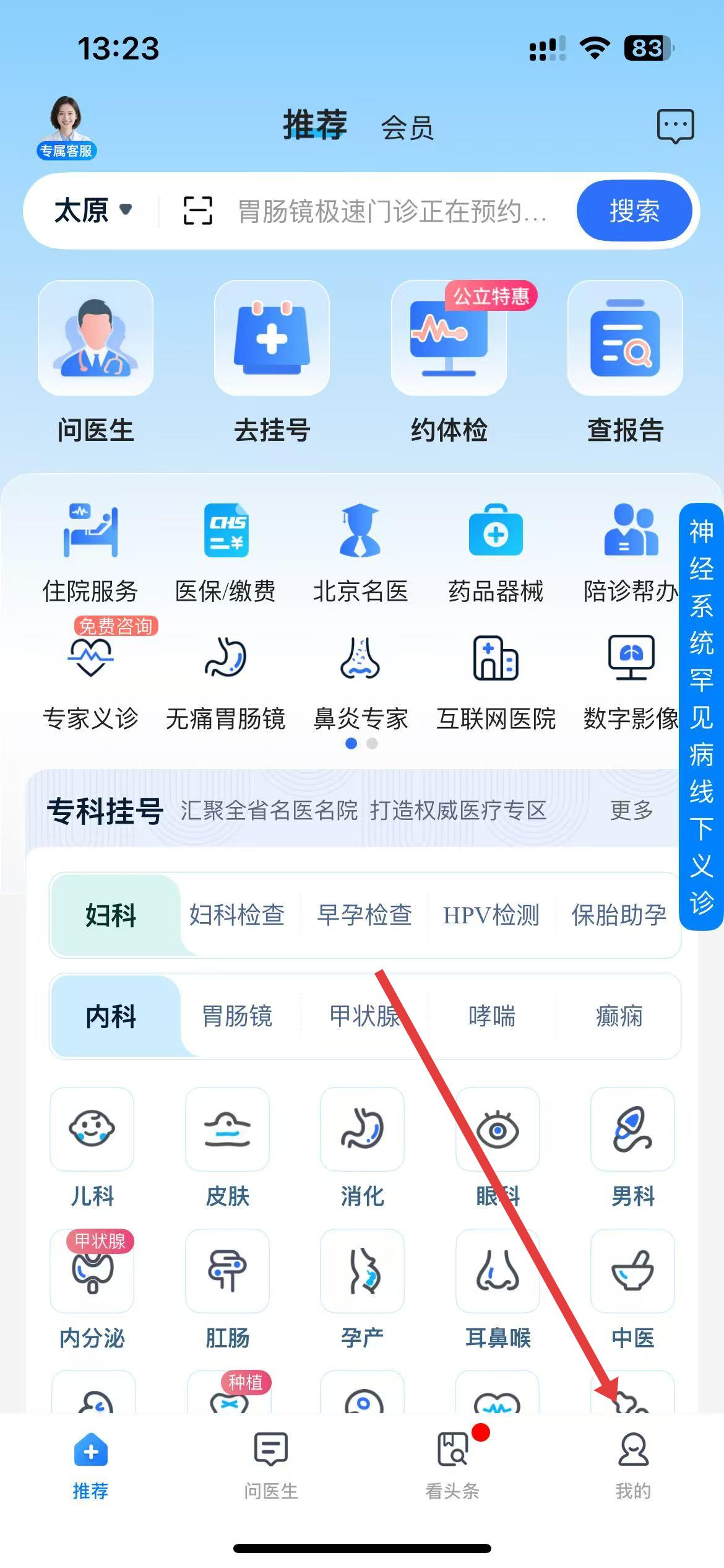 1、打開健康山西app,點擊底部導(dǎo)航欄最右側(cè)我的選項,進入個人相關(guān)頁面。