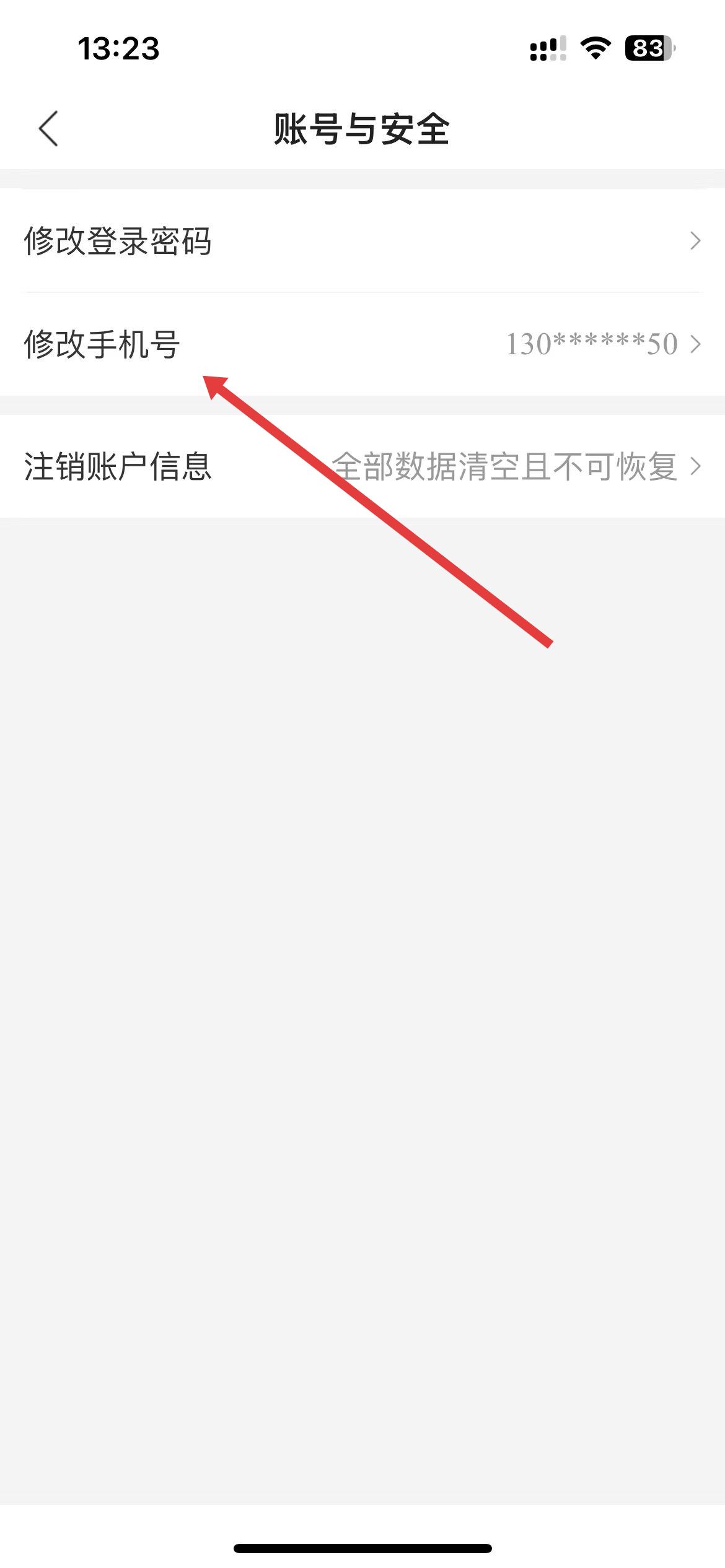 4、在賬號與安全頁面中,點擊修改手機號選項,進入修改手機號操作頁面。