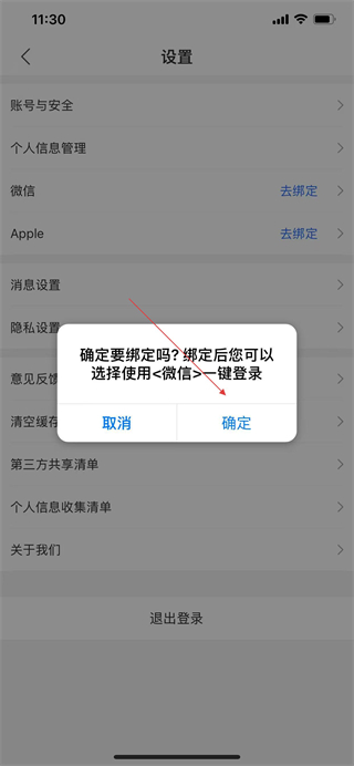 4、在彈出的確認彈窗中點擊確定,完成微信賬號的綁定操作。