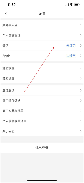 3、在設(shè)置界面中找到微信,點擊右側(cè)的去綁定。