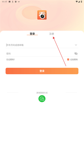 1、打開看護(hù)家的應(yīng)用APP,進(jìn)入時(shí)點(diǎn)擊登錄右側(cè)注冊(cè)的按鈕。