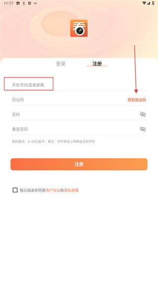 2、在注冊(cè)頁(yè)面內(nèi),輸入注冊(cè)的手機(jī)號(hào)并點(diǎn)擊獲取驗(yàn)證碼。