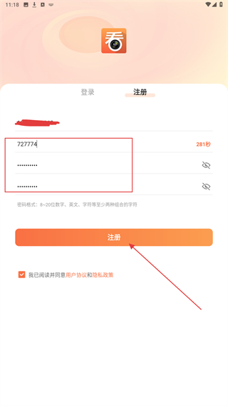 3、將收到的驗(yàn)證碼輸入其中后,再輸入密碼點(diǎn)擊注冊(cè)。