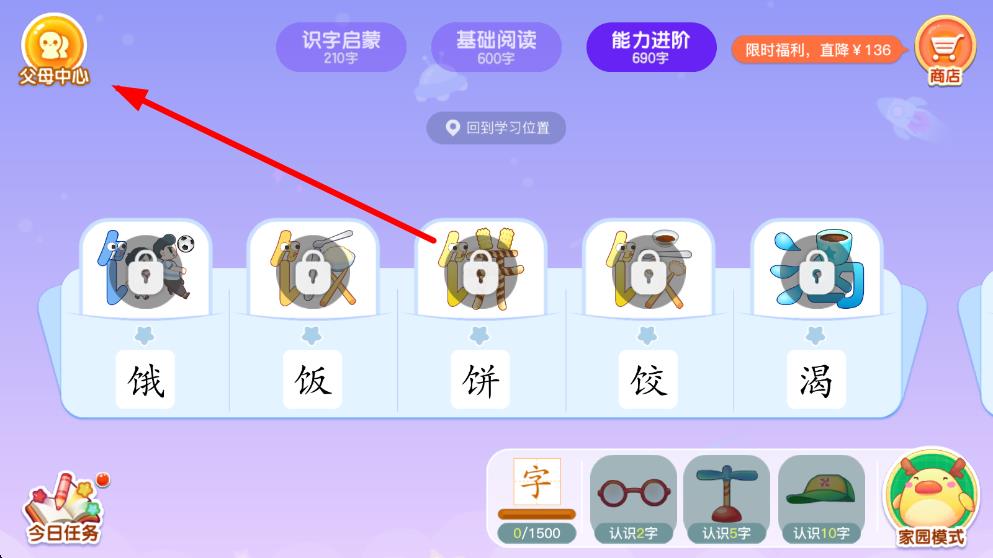 1、打開小伴龍識(shí)字app,在主界面左上角找到父母中心圖標(biāo),點(diǎn)擊進(jìn)入家長設(shè)置區(qū)域。