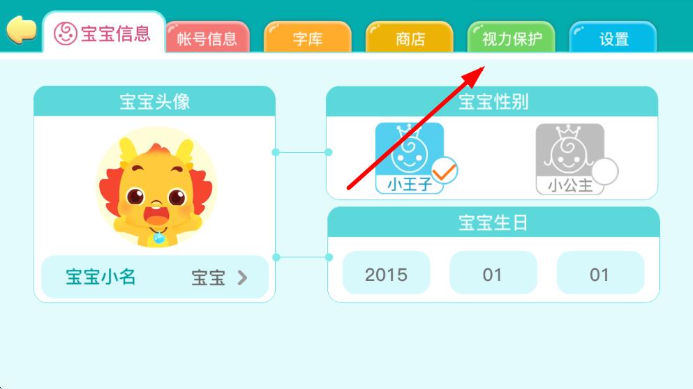 2、通過家長驗(yàn)證進(jìn)入后,在頁面上方的導(dǎo)航欄中找到并點(diǎn)擊視力保護(hù)選項(xiàng)。