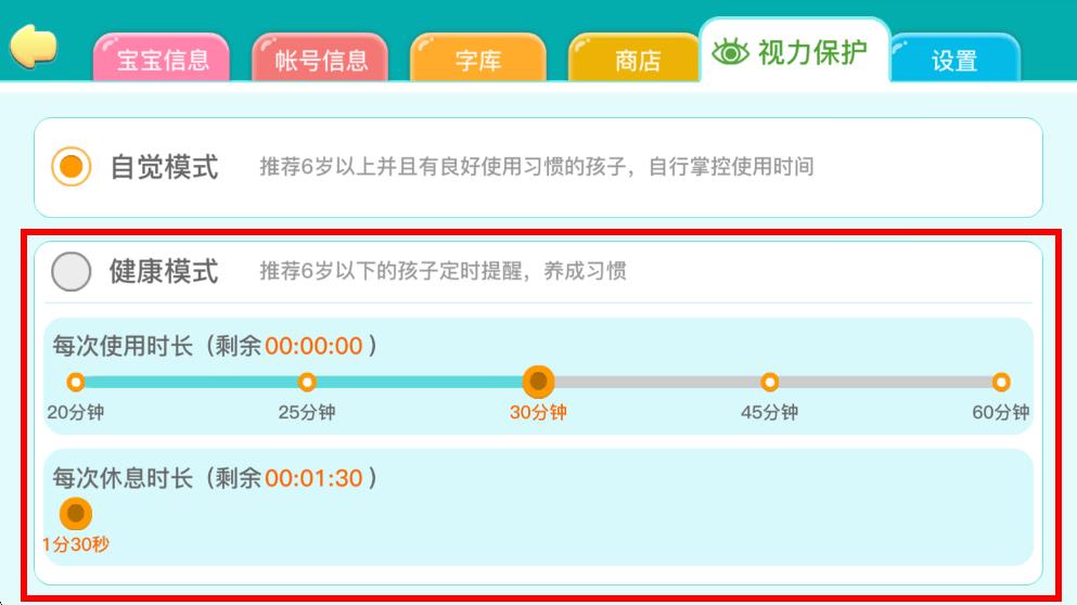 3、在視力保護(hù)設(shè)置界面中,選擇健康模式選項(xiàng),根據(jù)需求設(shè)置,合理規(guī)劃孩子的學(xué)習(xí)和休息時(shí)間,保護(hù)孩子視力。