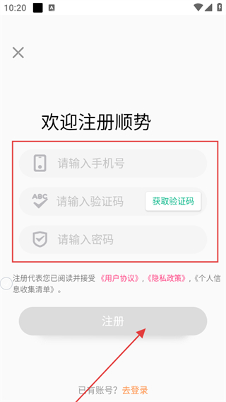 3、輸入手機(jī)號(hào)、驗(yàn)證碼,設(shè)置密碼,勾選同意相關(guān)協(xié)議后,點(diǎn)擊注冊(cè)。