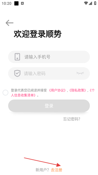 2、進(jìn)入登錄界面后,點(diǎn)擊下方新用戶?去注冊(cè)的文字,進(jìn)入注冊(cè)頁面。