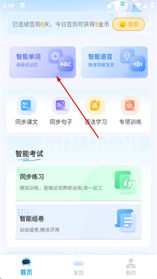 1、打開順勢(shì)智能英語APP,在首頁點(diǎn)擊智能單詞模塊,進(jìn)入智能單詞頁面。