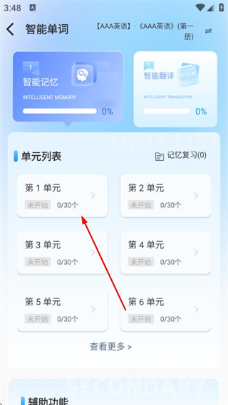 2、在智能單詞頁面選擇第1單元,進(jìn)入智能記憶頁面。