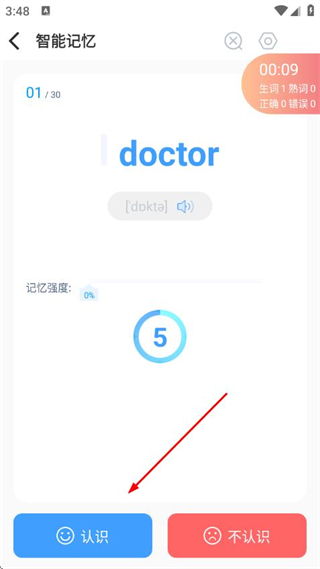 3、在智能記憶頁面,根據(jù)展示的單詞,判斷是否認(rèn)識(shí),點(diǎn)擊認(rèn)識(shí)。