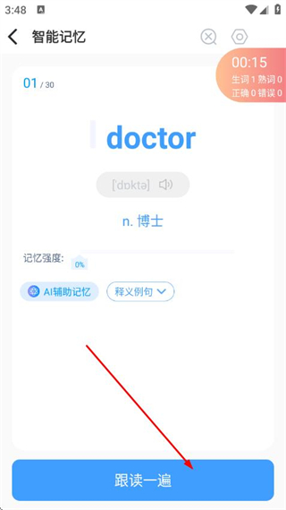 4、在單詞釋義展示頁面,點(diǎn)擊跟讀一遍,進(jìn)行單詞跟讀練習(xí)。