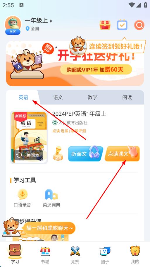 1、打開(kāi)好爸爸點(diǎn)讀機(jī)應(yīng)用,點(diǎn)擊英語(yǔ)學(xué)科,選擇所需的課本,點(diǎn)擊點(diǎn)讀課文按鈕。