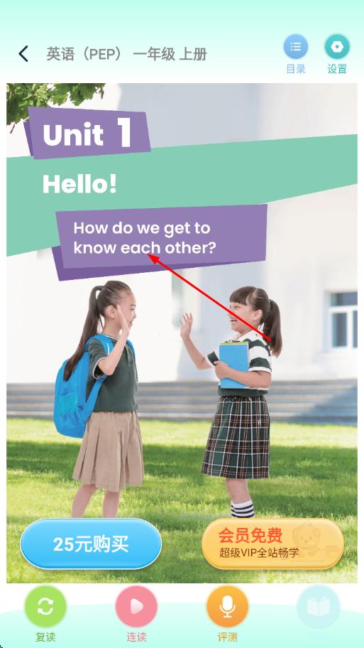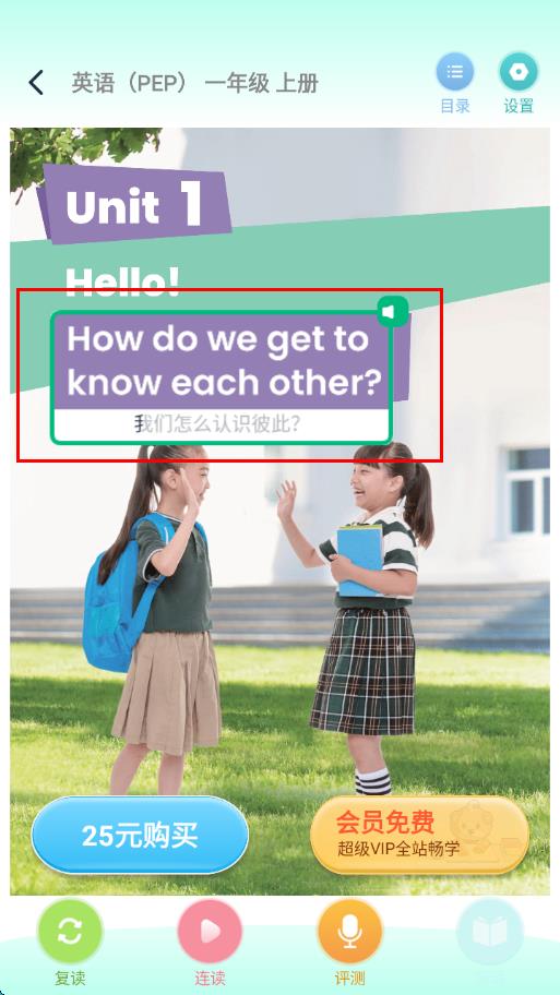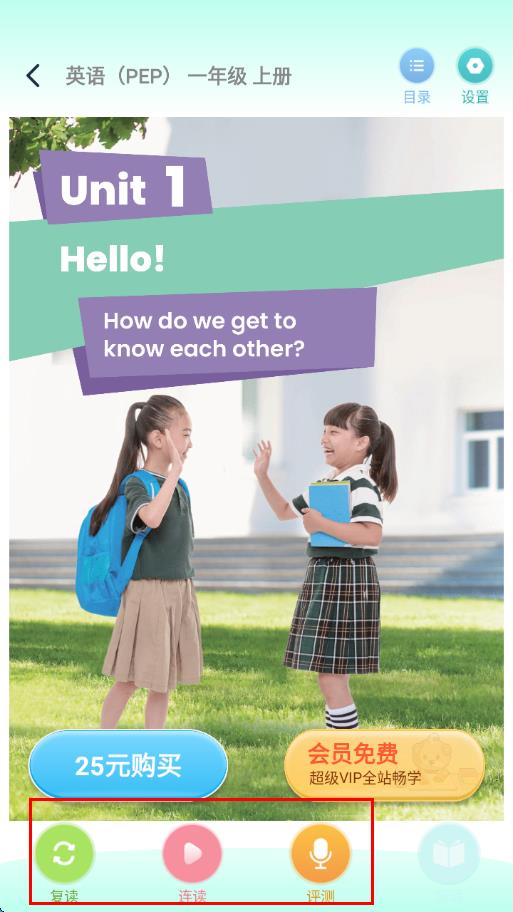 4、在頁(yè)面下方,使用復(fù)讀、連讀、評(píng)測(cè)等功能,幫助更好地學(xué)習(xí)和掌握英語(yǔ)內(nèi)容。