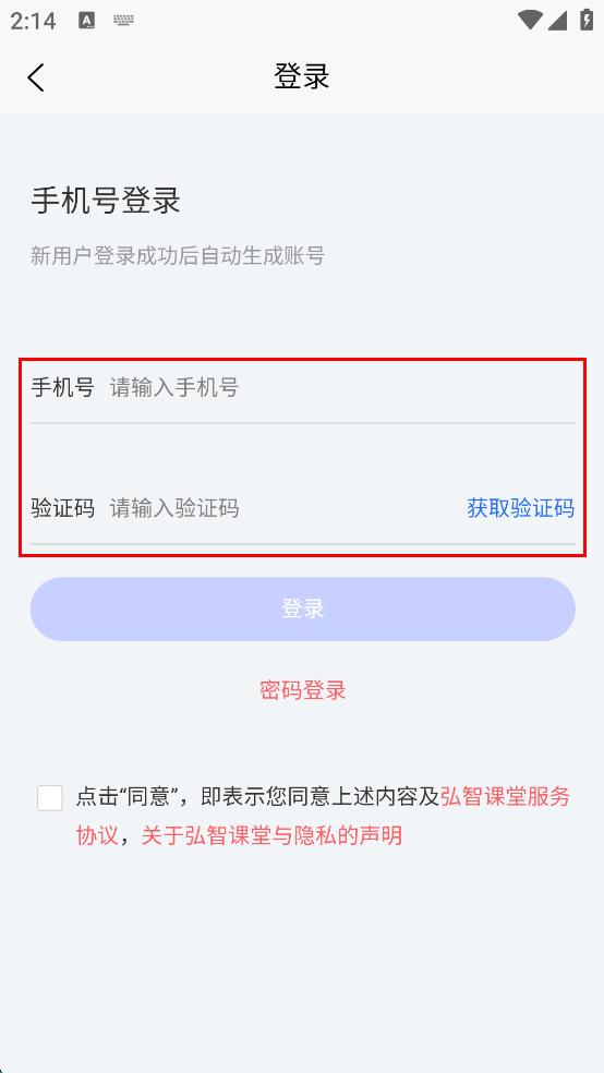 4、勾選同意相關(guān)服務(wù)協(xié)議及聲明的選項,點擊登錄按鈕,完成弘智課堂的登錄。
