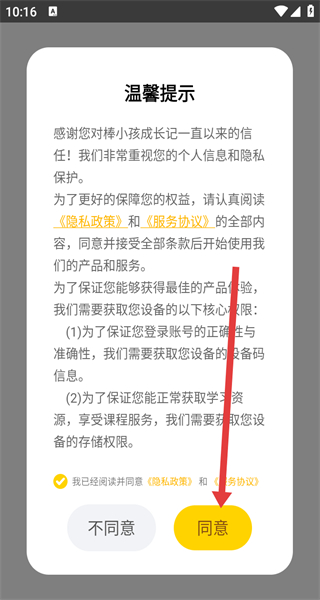 1、打開棒小孩成長記APP,點(diǎn)擊同意按鈕,確認(rèn)隱私政策和服務(wù)協(xié)議,進(jìn)入登錄界面。