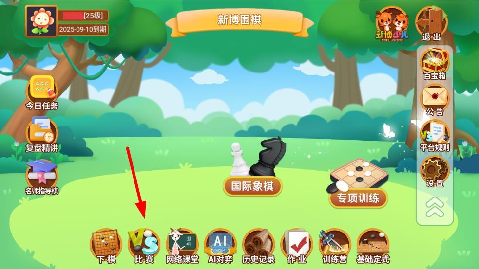 1、打開新博少兒對弈平臺app,進入主界面,點擊下方導(dǎo)航欄中的比賽圖標(biāo),進入比賽中心頁面。