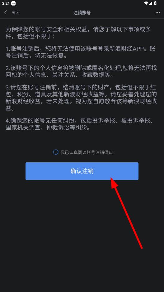 4、仔細(xì)閱讀注銷賬號(hào)相關(guān)須知后,勾選我已認(rèn)真閱讀賬號(hào)注銷須知,再點(diǎn)擊確認(rèn)注銷按鈕,即可完成賬號(hào)注銷。