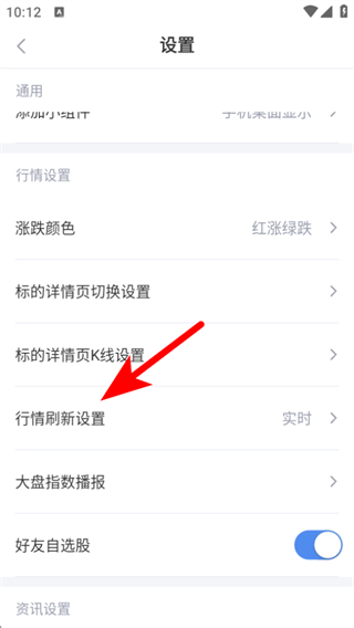 3、在設(shè)置頁(yè)面找到行情刷新設(shè)置選項(xiàng)并點(diǎn)擊,進(jìn)入刷新頻率頁(yè)面。