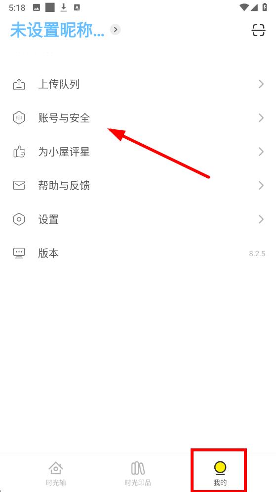 1、打開(kāi)時(shí)光小屋app點(diǎn)擊底部中我的圖標(biāo),進(jìn)入個(gè)人頁(yè)面后點(diǎn)擊賬號(hào)與安全選項(xiàng)。