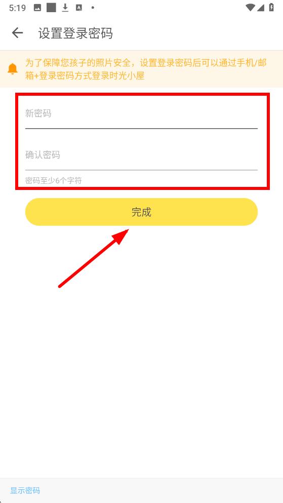 3、在設(shè)置登錄密碼頁(yè)面,依次輸入新密碼和確認(rèn)密碼,輸入完成后點(diǎn)擊完成按鈕即可完成密碼設(shè)置。