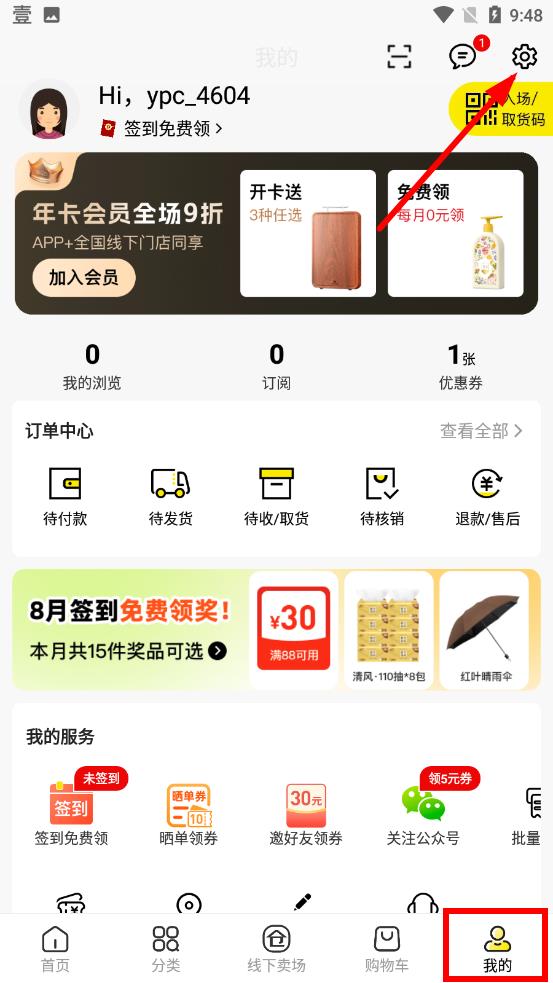 1、打開壹品倉app,點擊底部導航欄中的我的選項進入個人頁面,再點擊頁面右上角的設置圖標。