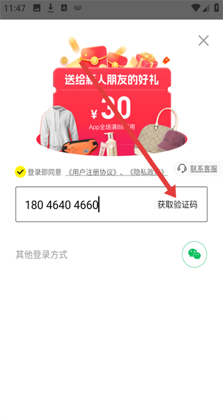 3、輸入手機號,勾選“登錄即同意《用戶注冊協(xié)議》、《隱私政策》”,點擊“獲取驗證碼”。