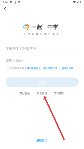 2、在一起中學(xué)登錄頁面中,可以點(diǎn)擊下方短信登錄按鈕,切換登錄方式。
