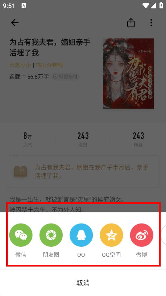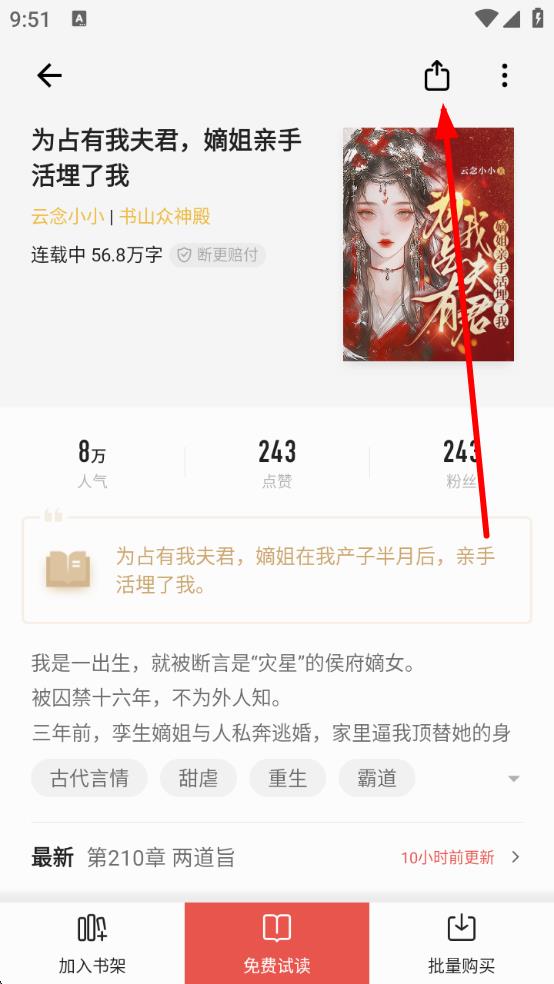 2、進(jìn)入書籍詳情頁面,點(diǎn)擊右上角的分享圖標(biāo)喚起分享選項(xiàng)。